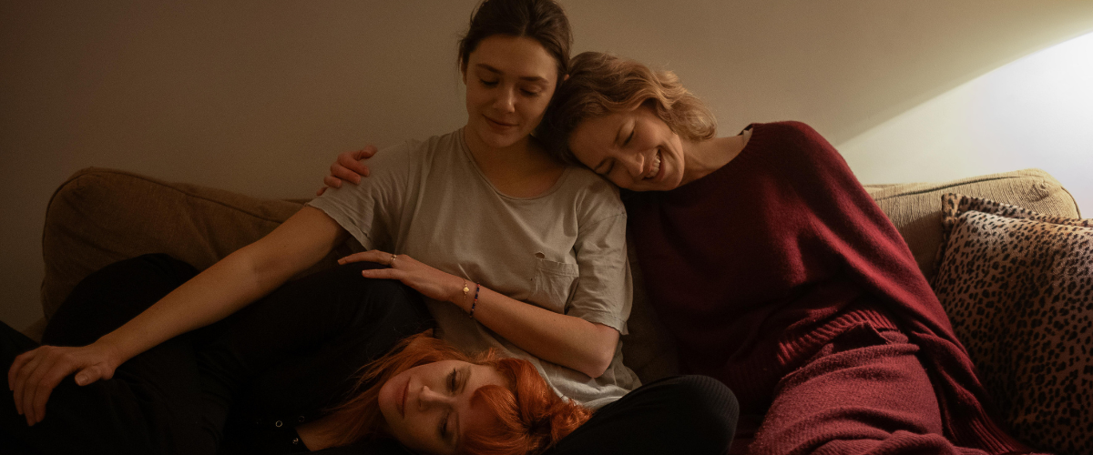 In that opening scene, we meet Katie (Carrie Coon), Christina (Elizabeth Olsen) and Rachel (Natasha Lyonne). Katie’s arms are crossed—a recurring body language choice by Coon and Jacobs to illustrate how closed off this constant planner is from those around her—as she rants about the fact that her dying father Vincent (Jay O. Sanders) doesn’t have a DNR. She’s doing all she knows how to do in the moment, channeling her emotional upheaval into action items. (I can relate almost too much.) Sister Christina is more open and warm, facing the hallway down which her dad rests. At first, Rachel seems almost checked out, more eager to get high and check on her active sports bets than talk to either of them.